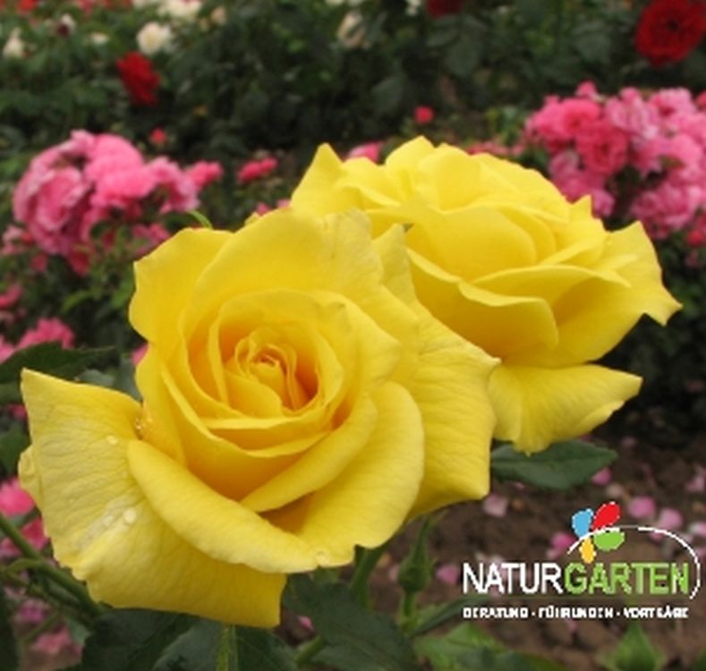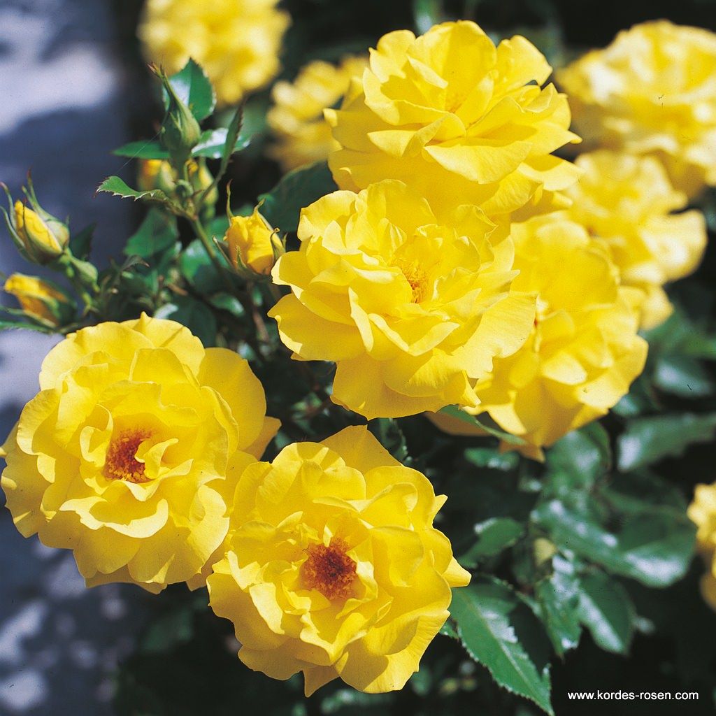 Beetrose Blüten in reinem Gelb, gefüllt, fruchtig duftend, Wuchs aufrecht, buschig, Höhe: 60-80 cm, sehr gesund, ADR Rose