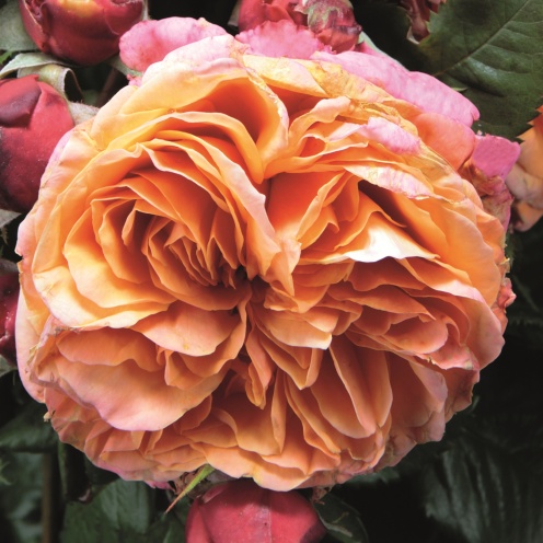 nostalgische Edelrose mit kompaktem und stark buschigem Wuchs, große, schalenförmige, geviertelten Blüten, dunkelorange und apricotfarben nach Pfirsich duftend