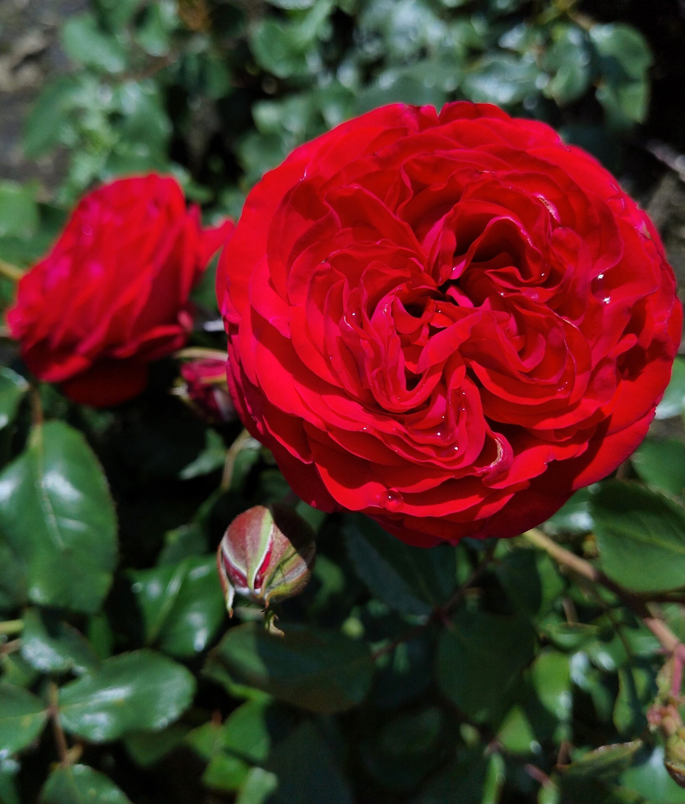 Beetrose; dunkelrote, gefüllte und leicht duftende Blüten; gesundes, glänzend dunkelgrünes Blattwerk