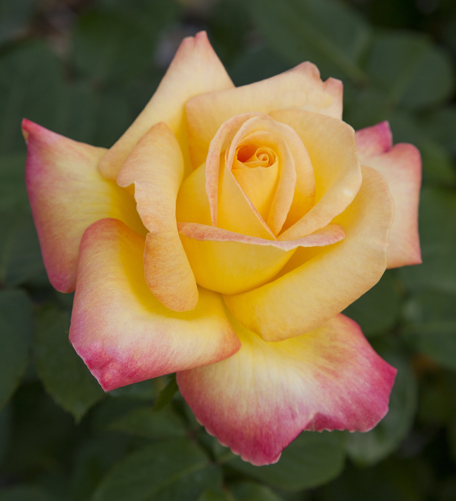 Edelrose; gefüllte Blüte, gelb mit dunkelrosa Rand; zart duftend; öfterblühend; widerstandsfähig gegen Krankheiten