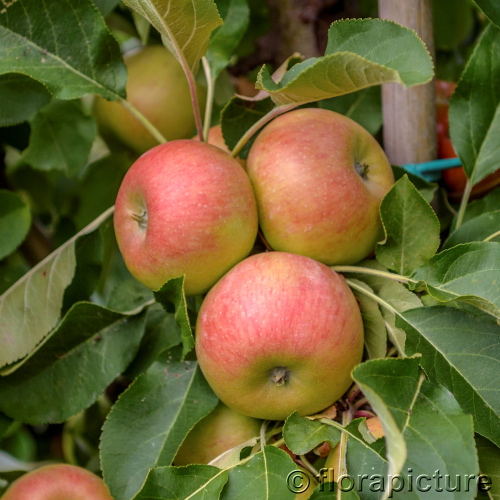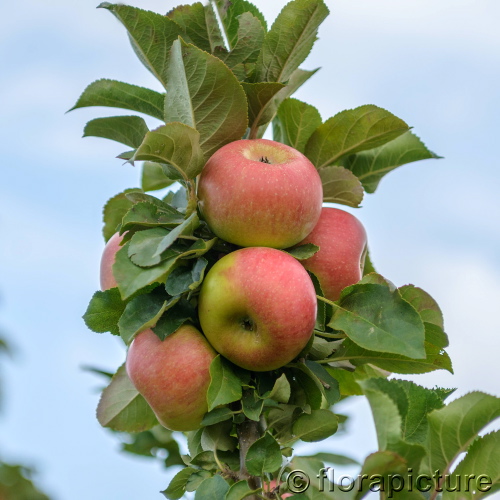 Wuchs spindelförmig, kompakt, Frucht mittelgroß, grüngelb mit orangeroter Backe, sehr saftig mit harmonischem Geschmack, Reife Oktober bis Dezember