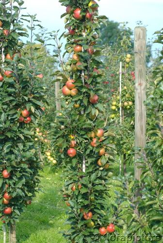 Wuchs pyramidal, kompakt, Frucht groß leuchtend rot, sehr saftig, säuerlich süß,