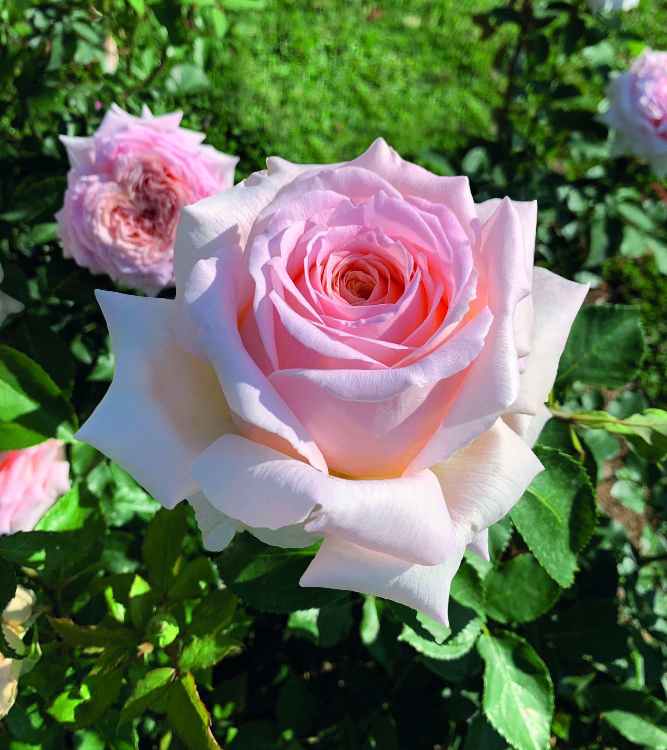 aussergewöhnliche Strauchrose, hellrosa mit elfenbeinfarbener und pfirsichfarbener Mitte, starker Duft, öfterblühend; dichtes, dunkelgrünes Laub; fast dornenlos; sehr robust