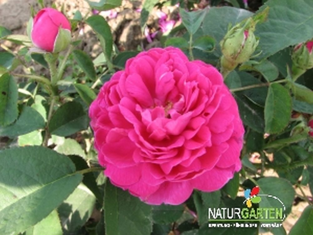 Strauchrose; Damaszener-Rose, Blüten: purpurrot, sehr dicht gefüllt; öfterblühend; stark duftend; robust und frosthart, ca. 1m hoch wachsend