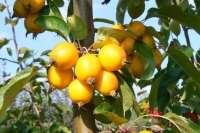 Kleine kräftig gelb leuchtende Früchte, die bis Ende Januar am Baum hängen bleiben, essbar,